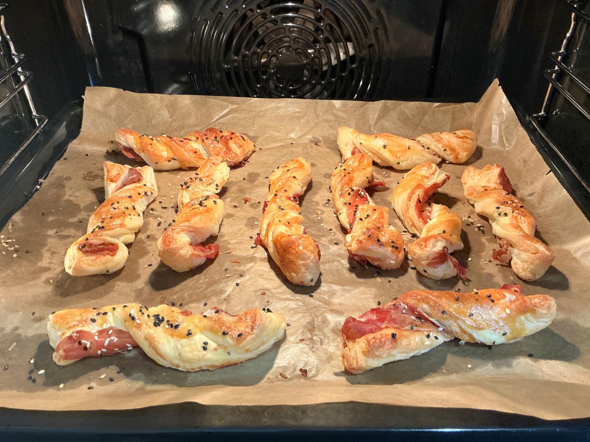 Puff pastry appetizers are a tried-and-true recipe for party food or a quick afternoon snack. They always disappear quickly. These rolled puff pastry sticks taste delicious with various homemade sauces, ready-made ketchup, or BBQ sauce. They also work perfectly as a snack with creamy soup. The crispy pastry is topped with aromatic, salty cheese and smoked ham. It’s a combination that never fails.