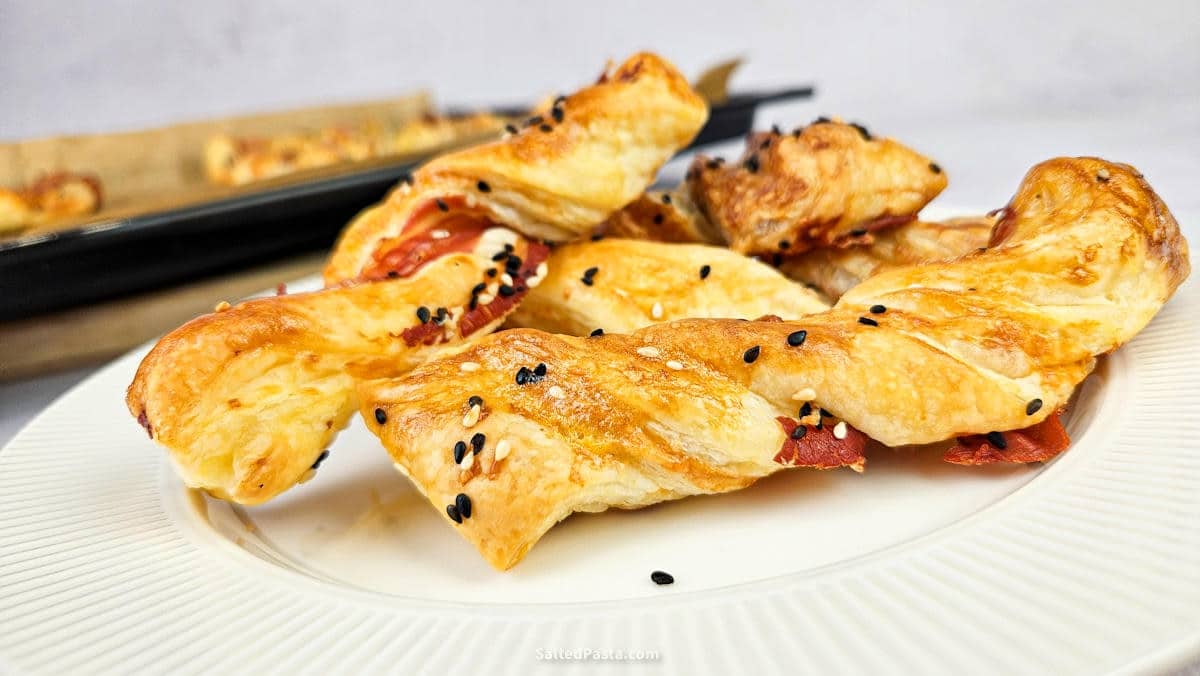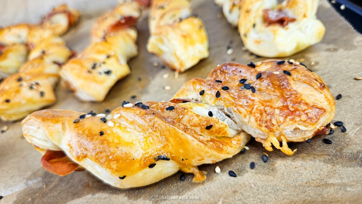 - Sprinkle half of the puff pastry with grated Parmesan cheese and fold it along the long side. Put slices of Parma ham on the puff pastry. Cut strips of dough approximately 3 cm wide. Roll each strip (twist). Brush with beaten egg and sprinkle with sesame seeds for garnish.275 g puff pastry, 25 g parmesan cheese, 5 slices Parma ham, 1 tsp sesame, 1 egg