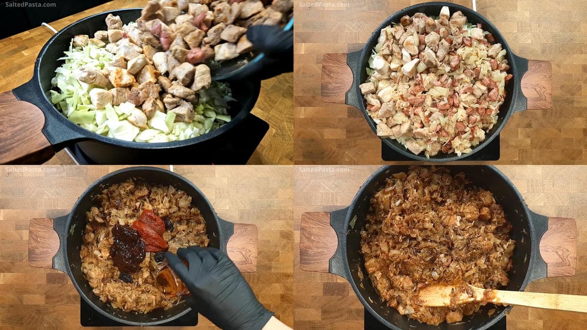- Other: Tomato paste adds color and acidity; you can skip it. It’s useful if you want to make bigos quickly. Then you don’t have to fry the cabbage as long. Gravy – if you have sauce in the fridge from the previous day, such as fat from roasting chicken drumsticks, pork neck, or other meat, pour it into the bigos! It will add more flavor. The more meat and fat you use, the tastier the bigos.