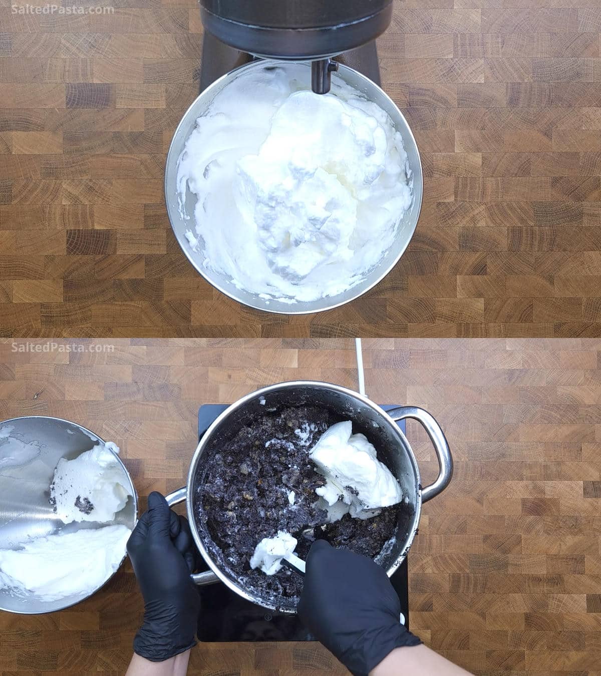 - While the mixture is cooling, whisk the egg whites with a pinch of salt. Add the beaten egg whites into the cooled mixture. It's best to add the egg whites in batches and mix them in with a spatula to prevent them from collapsing too much.salt, 5 egg whites