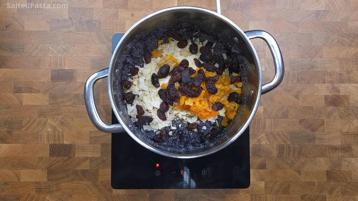 - While the dough is rising, prepare the poppy seed filling.Chop the nuts and dried fruit into larger or smaller pieces, depending on your preference.Bring 450 ml of water to a boil in a pot (or pour it from the kettle) and add the poppy seeds. Cook the poppy seeds over low heat, stirring frequently to prevent burning. Add the chopped dried fruit, sugar, honey, and flavorings. Cook for a few minutes. Finally, add the butter and breadcrumbs. Cook and stir until the butter is completely melted. Cook for a total of about 5-10 minutes. Set aside to cool.400 g ground poppy seeds, 450 g water, 150 g sugar, 100 g dried apricots, 100 g raisin, 100 g walnuts, 100 g almond flakes, 100 g honey, 1 tsp cinnamon, 50 ml amaretto, 15 g almond sugar, 50 g butter, 3 tbsp breadcrumbs, 1 tbsp candied orange peel