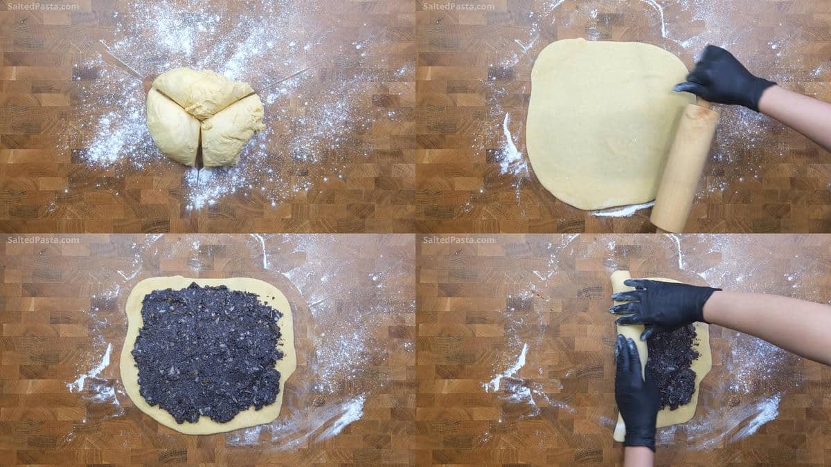 - Place the risen dough on a floured surface. Divide the dough into three pieces. Return two pieces to the bowl and cover to prevent drying. Roll out one piece to form a rectangle about 5 mm thick. Spread â…“ of the poppy seed filling over the dough and fold it (see how to do this in the video).