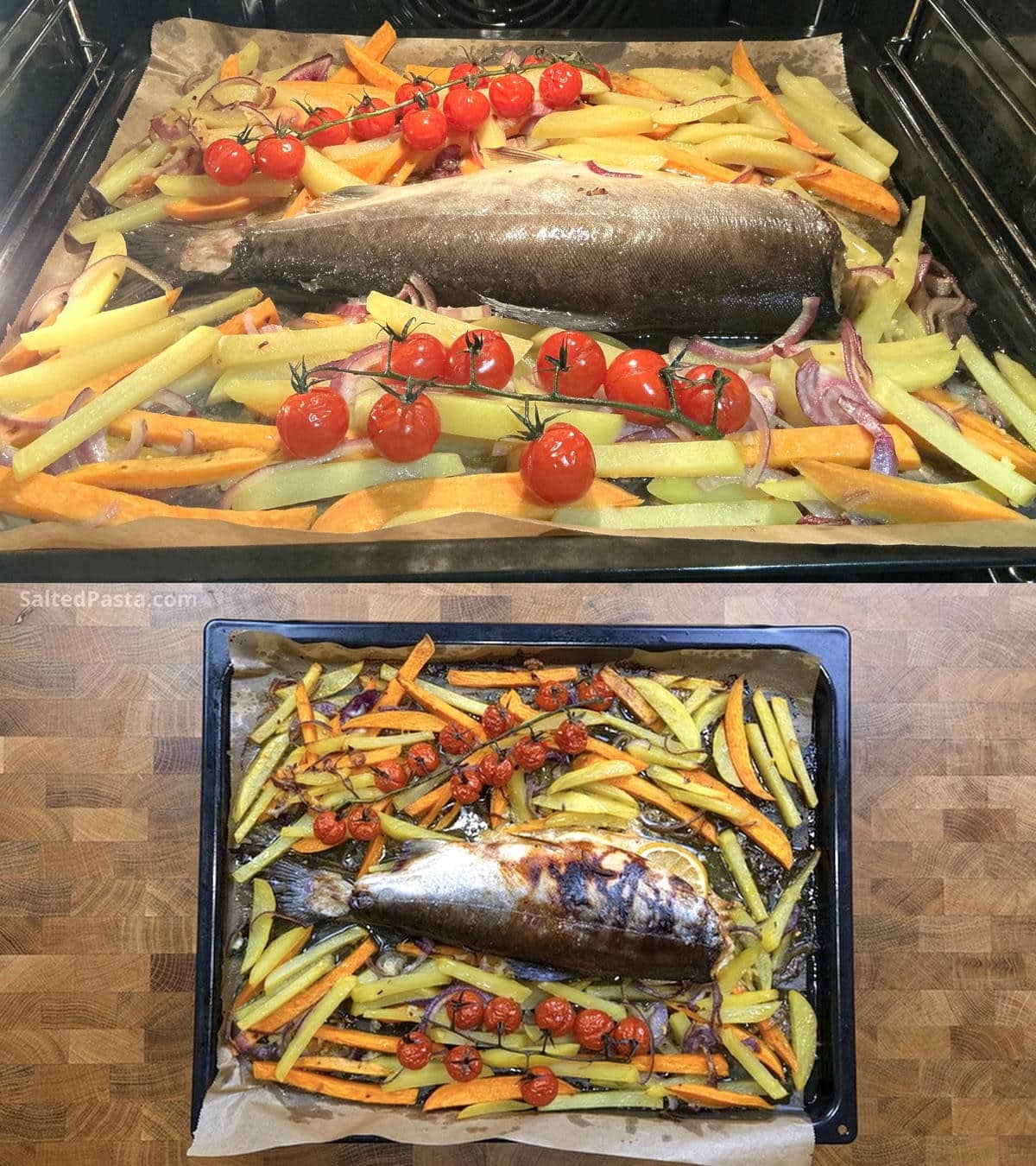Read the step-by-step recipe on how to prepare baked salmon with sweet potatoes and fries, and watch the video below the recipe.