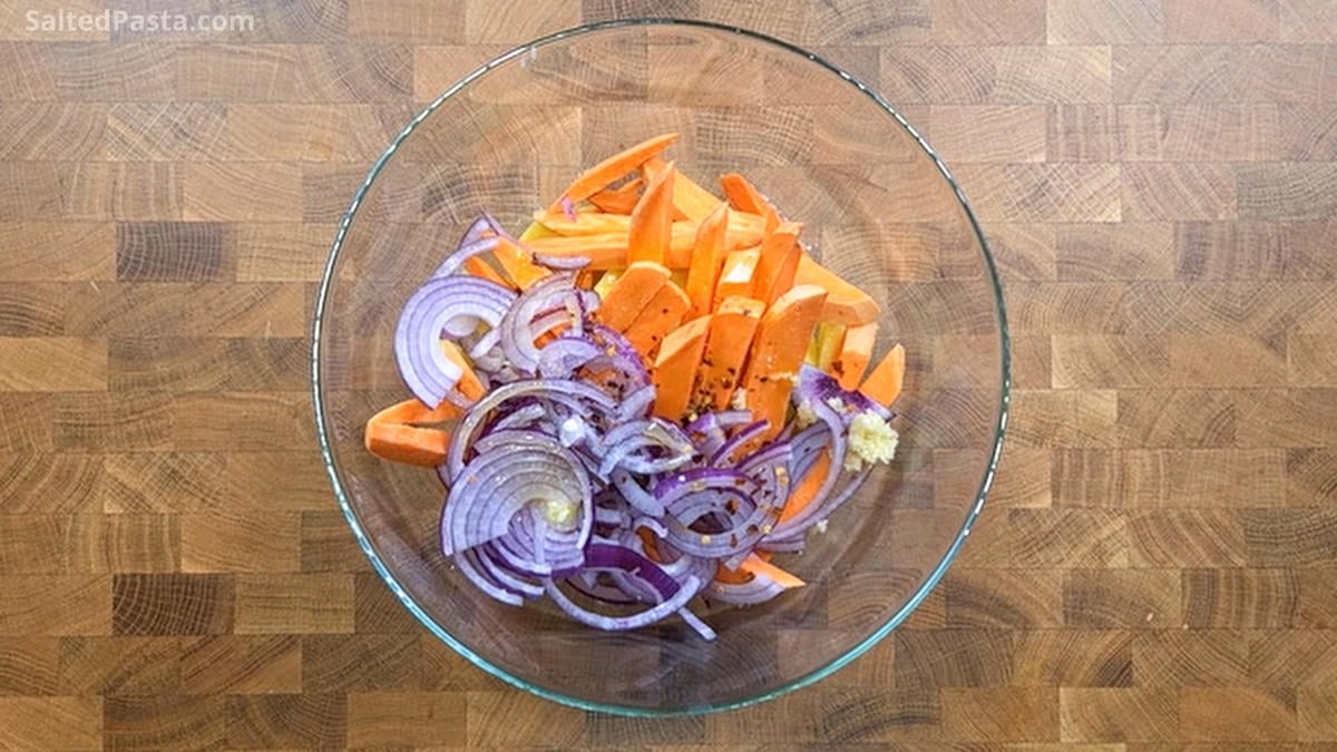 • Cut the potatoes and sweet potatoes into strips (for French fries). Slice the onion. Place the chopped vegetables in a bowl and drizzle with olive oil. Add ½ teaspoon chili powder, 1 crushed garlic clove, salt, and mix.