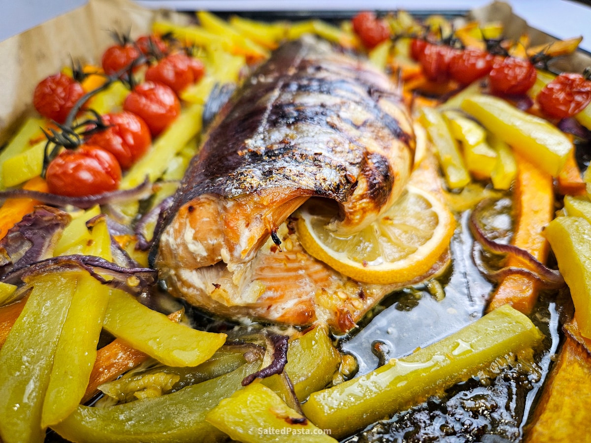An easy recipe for a delicious, quick dinner. Mildly spicy with a hint of sweetness. A simple, aromatic, and flavor-packed fish with vegetables. You can prepare it using a salmon fillet, a steak cut, or a whole fish. It’s a great idea for baking fish whole in the oven.