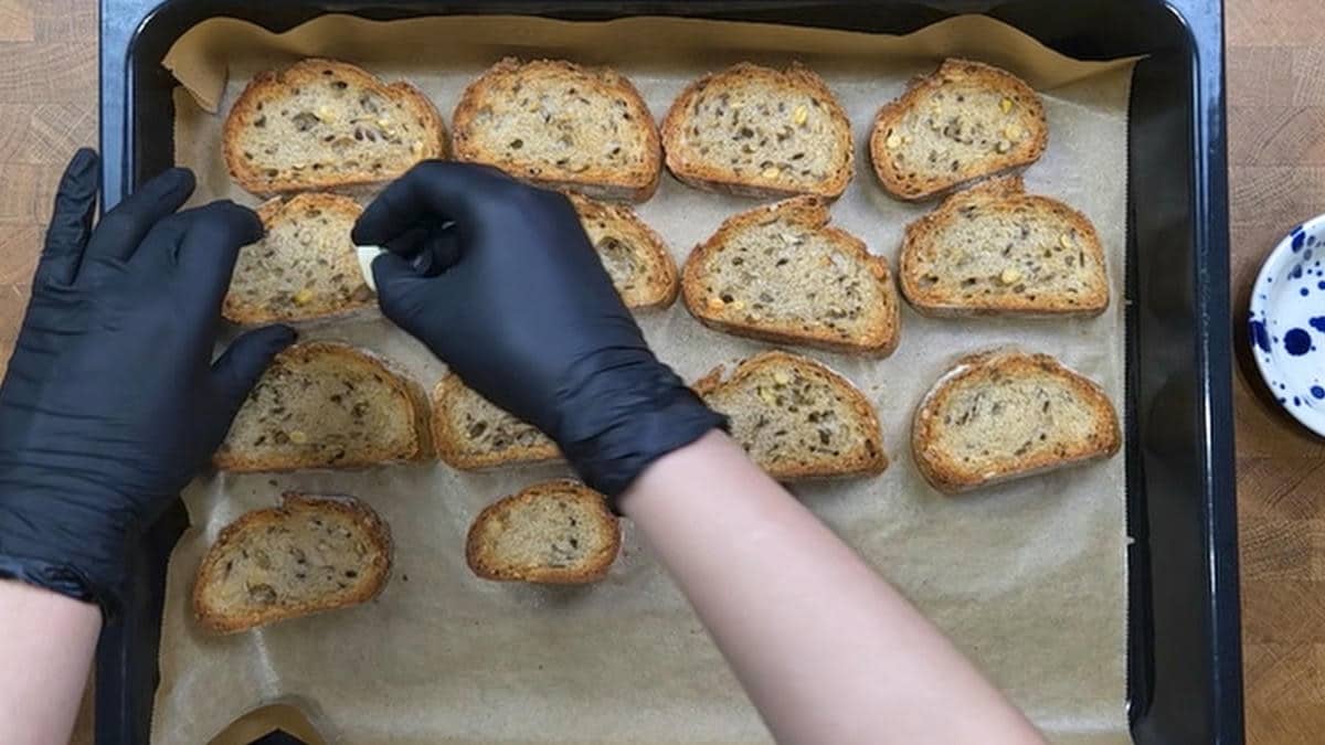 • Upieczone grzanki natrzyj przekrojonym na pół ząbkiem czosnku.