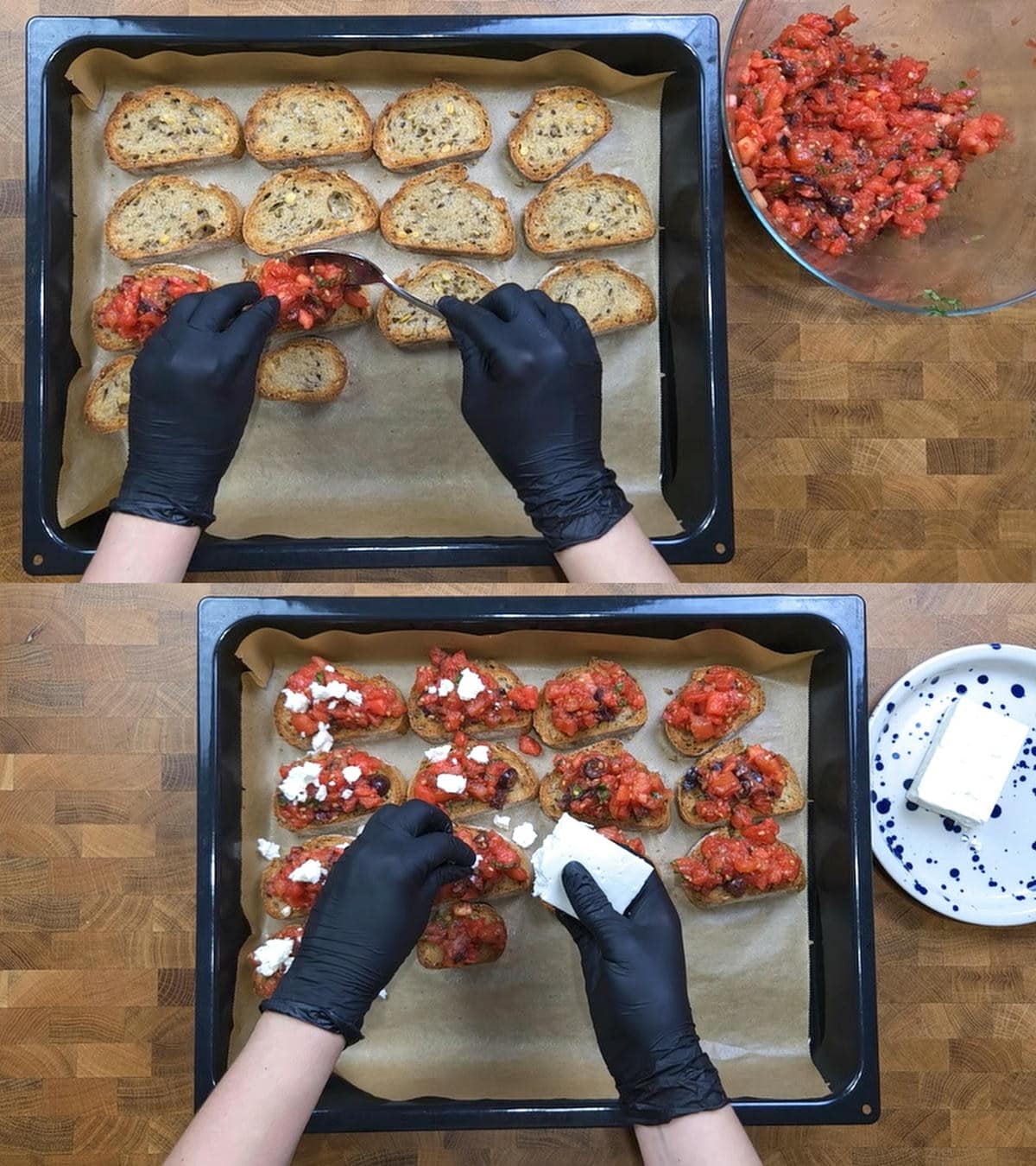 Kultowe włoskie grzanki z pomidorem z greckim twistem. Jeśli jesteś fanem tej włoskiej przekąski to spróbuj jej w nieco innej wersji w dodatkiem oliwek i fety. To doskonały pomysł na lekką kolację lub imprezowy finger food.