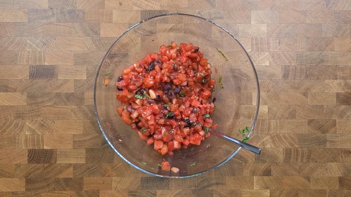 • Pomidory pokrój w drobną kostkę. Ja pomidory zawsze obieram, ale nie musisz tego robić. Dodaj sól i połóż na sitku by pozbyć się nadmiaru wody z pomidorów. Dodatek soli sprawi, że pomidory puszczą więcej wody. Odstaw na ok. 15 minut. W tym czasie pokrój na mniejsze kawałki oliwki i posiekaj bazylię.