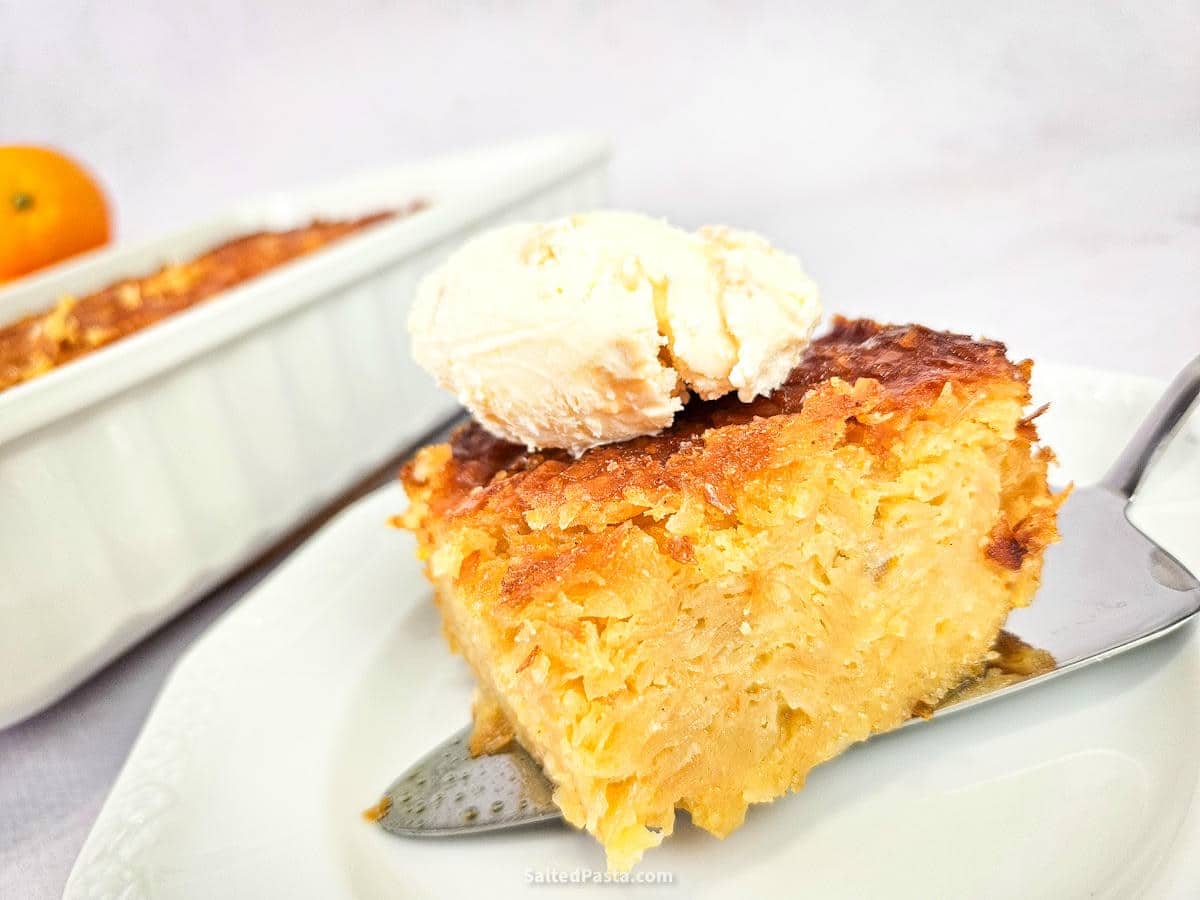 - Upieczone ciasto wyciągnij z piekarnika i jeszcze gorące ponakłuwaj widelcem w wielu miejscach. Następnie polej syropem przecedzonym przez sitko. Ciasto wchłonie cały syrop. Kiedy ciasto ostygnie owiń je folią i włóż na kilka godzin do lodówki. Podawaj z lodami. Smacznego!