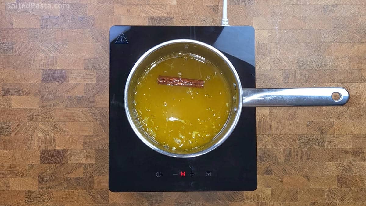 - Kiedy ciasto filo wysycha przygotuj syrop cukrowy. Wszystkie składniki na syrop włóż do rondla i zagotuj. Gotuj przez ok. 10 minut. Gotowy syrop odstaw do ostygnięcia.150 g wody, 400 g cukru, 300 g soku pomarańczowego, 1 łyżeczka skórki pomarańczowej, 1 laska cynamonu