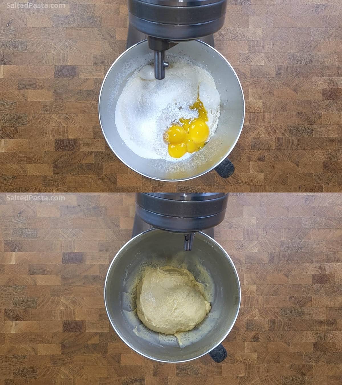 • Kiedy znad mąki zacznie wychodzić piana możesz dodać resztę składników do zaczynu. Dodaj żółtka, resztę cukru, cukier waniliowy i sól. Mieszaj przez ok. 5 minut. Następnie, cały czas mieszając, dodaj powoli roztopione masło. Wyrabiaj przez kolejne kilka minut, aż ciasto będzie gładkie i elastyczne. Następnie przykryj i odstaw do wyrośnięcia na ok. 30 minut.