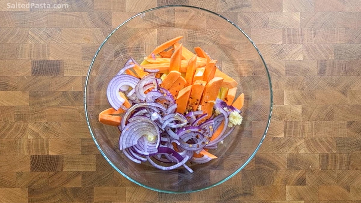 - Ziemniaki i bataty pokroić w słupki (na frytki). Cebulę pokroić w piórka. Pokrojone warzywa wrzucić do miski, polać oliwą z oliwek. Dodać ½ łyżeczki chili, 1 ząbek czosnku przeciśnięty przez praskę, sól i wymieszać.3 średnie ziemniaki, 1 średni batat, 1 średnia czerwona cebula, 1 łyżeczka płatków chili, 4 łyżki oliwy z oliwek, sól, 2 ząbki czosnku