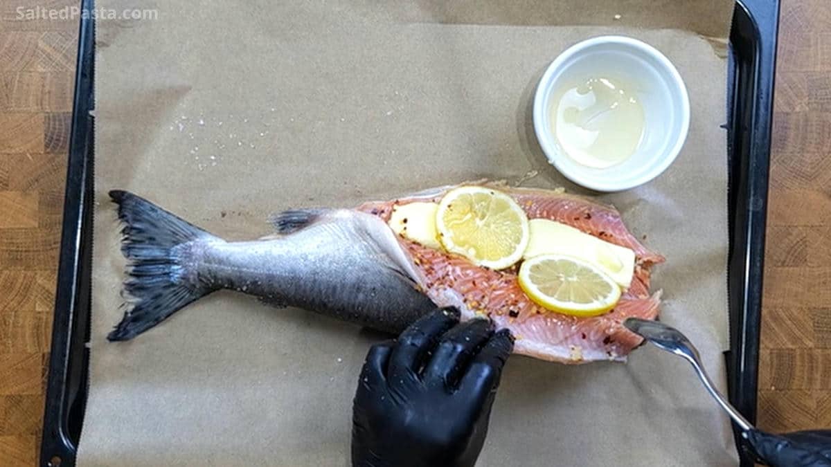 - Rybę dokładnie umyć i osuszyć. Następnie położyć na blasze wyłożonej papierem do pieczenia i posypać solą od strony skóry i w środku. Do środka ryby (lub na wierzch w przypadku fileta i dzwonko) dodać ½ łyżeczki chili, 1 ząbek czosnku przeciśnięty przez praskę i wetrzeć w mięso. Na końcu dodać miód, masło i plasterki cytryny.700 g łososia, 2-3 plastry cytryny, 1 łyżeczka miodu, 30 g masła, 2 ząbki czosnku, sól, 1 łyżeczka płatków chili