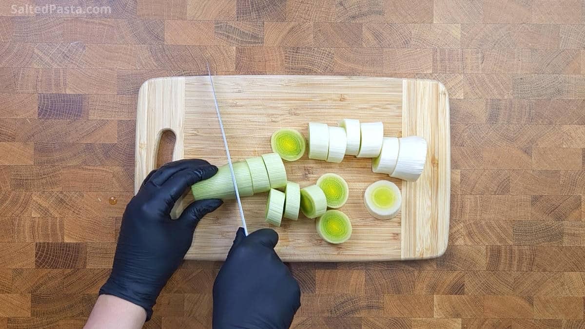 - Łososia umyj, osusz i pokrój na porcje. Pora pokrój w plastry ok. 1 cm grubości.500 g łososia, 1 duży por