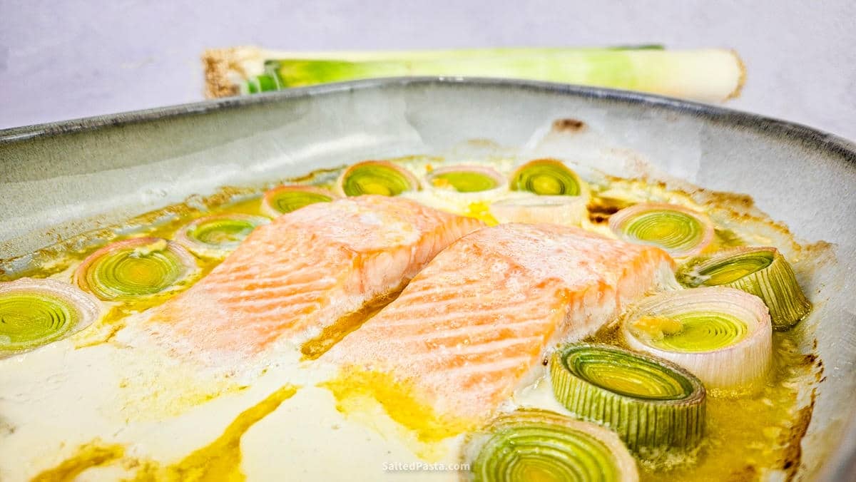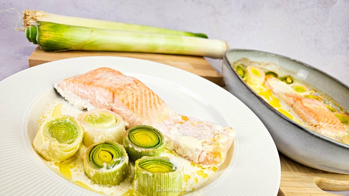 Pyszny soczysty łosoś w delikatnym śmietanowo-winnym sosie z pieczonymi porami. Brzmi wykwintnie, ale jest banalnie proste w przygotowaniu. Nie potrzebujesz przypraw ani ziół, które przyćmiłyby tylko smak łososia. Ryba przygotowana w żaroodpornym naczyniu idealnie sprawdzi się na świątecznym stole, na romantyczną kolację czy szybki posiłek. Jest to ekstremalnie łatwe i smakowite danie!