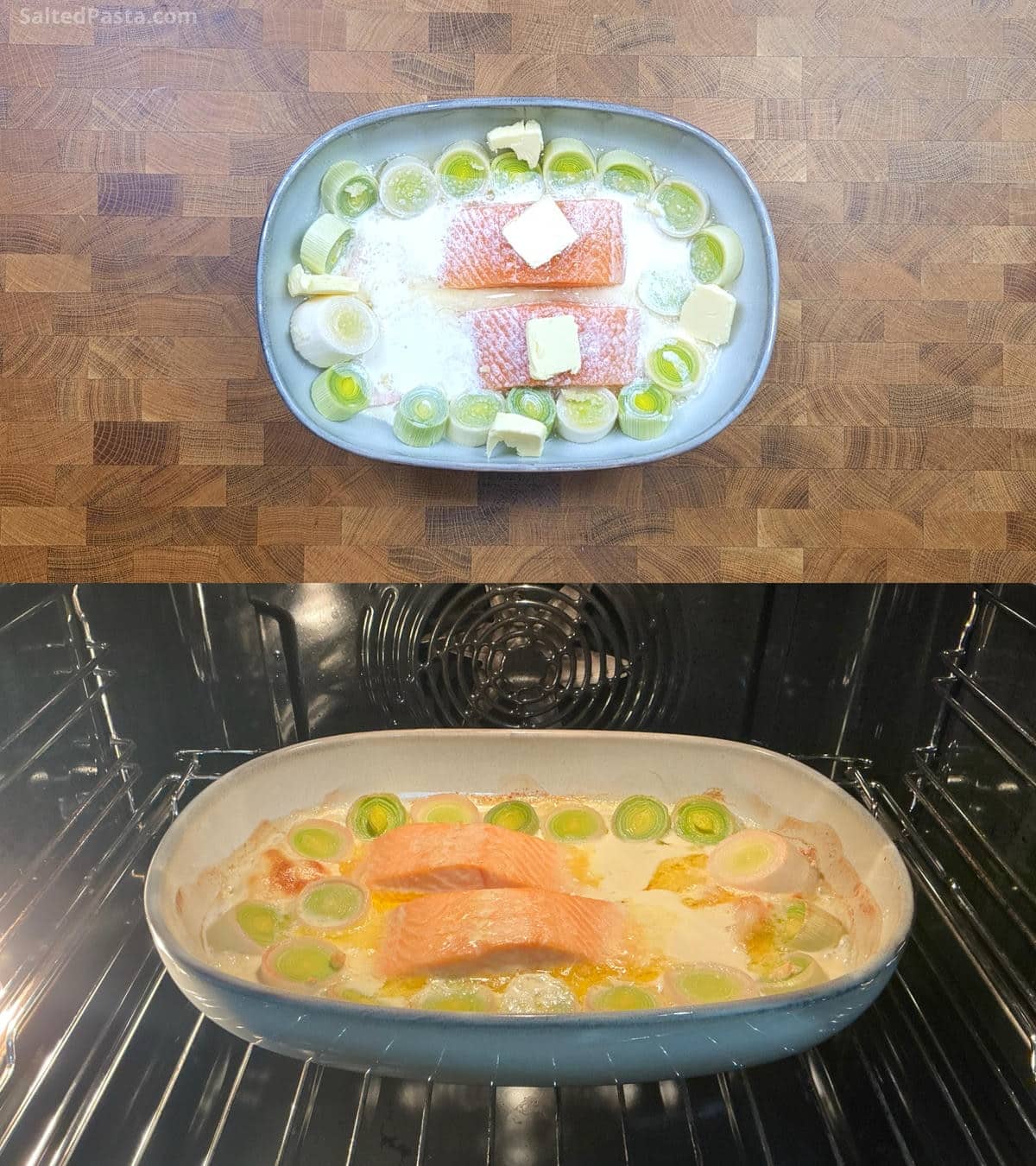 - Do naczynia żaroodpornego przełóż łososia i kawałki pora. Dodaj wyciśnięty przez praskę czosnek. Dodaj wino, śmietankę, kawałki pokrojonego masła, sól a następnie włóż do piekarnika nagrzanego do 220 °C i piecz przez ok. 15 minut. Smacznego!1 ząbek czosnku, 50 g masła, 100 ml śmietanki 30%, sól, 100 ml białego wytrawnego wina