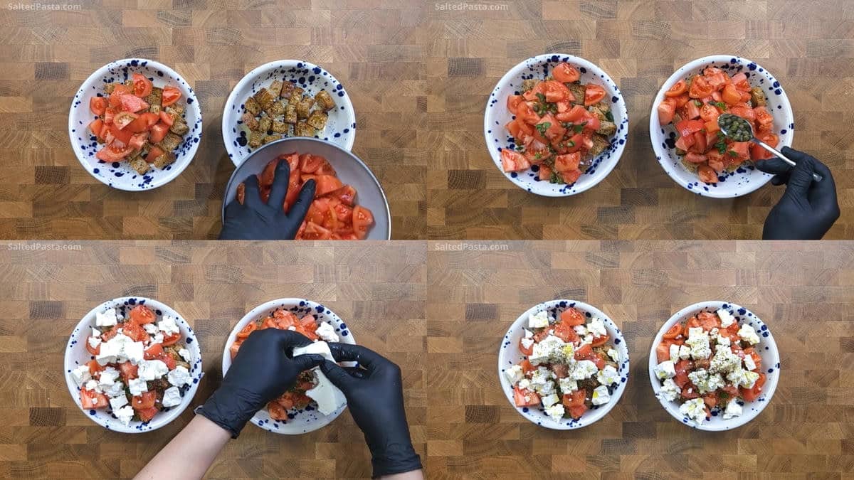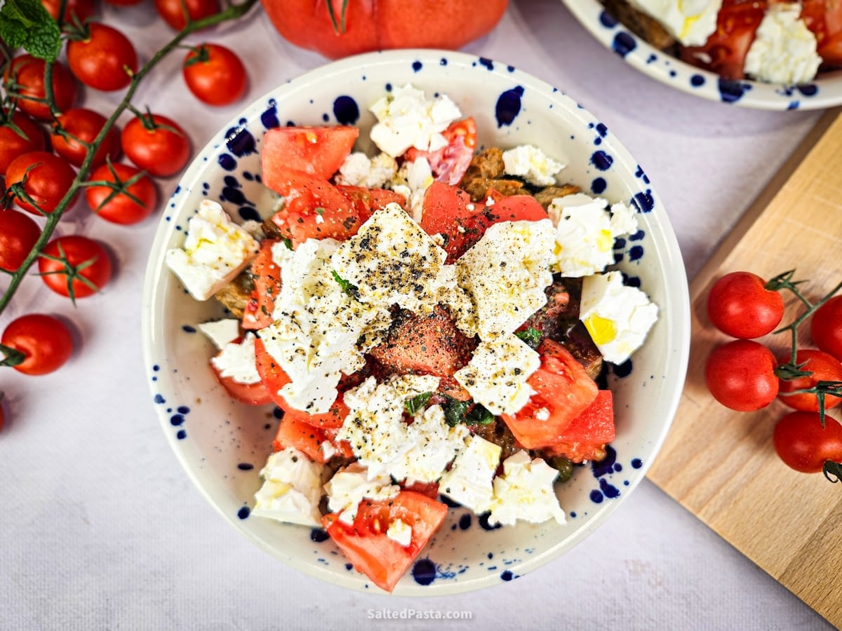 Serwowana albo na kawałku suchara jak bruschetta lub w formie sałatki. Tradycyjnie robiona z greckich jęczmiennych lub pszennych sucharów. W greckich sklepach mają ich naprawdę spory wybór. Na nich układa się porcję startych pomidorów i kawałki fety, a do tego oliwa i gotowe! Ja jednak przygotowuję ją w takiej wersji w jakiej jadłam ją na wakacjach czyli właśnie sałatki.