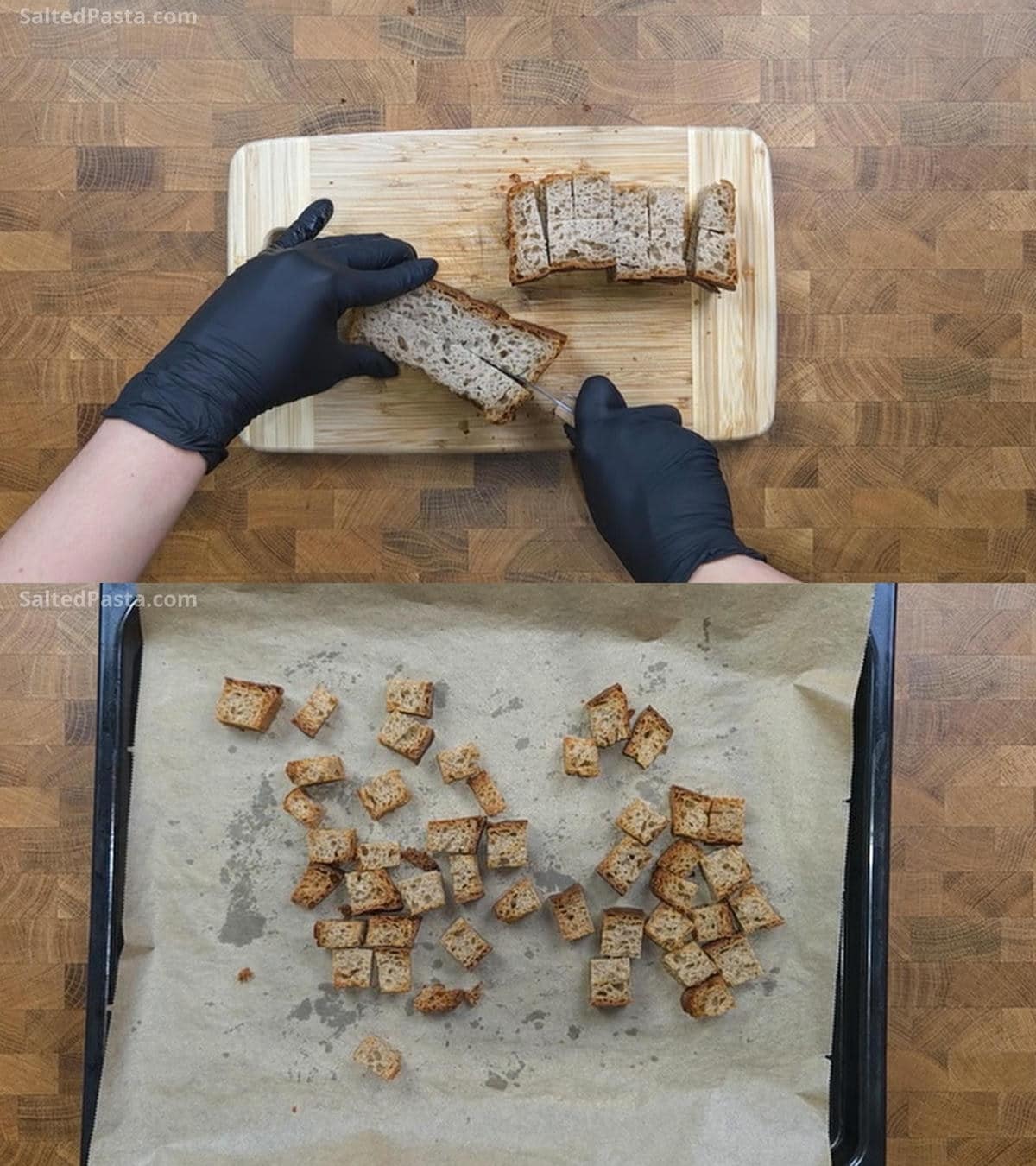 - Jeśli używasz gotowych sucharków możesz pominąć ten krok.Chleb pokrój w średnią kostkę. Ułóż na blasze i piecz przez ok. 10 minut w 180 °C aż się wysuszy i zrumieni.4 kromki chleba