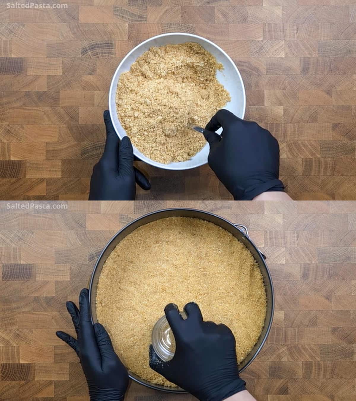 - Wszystkie składniki wyjmij wcześniej z lodówki by osiągnęły temperaturę pokojową.Herbatniki rozdrobnij. Dodaj roztopione masło, sól i wymieszaj. Na tortownicę wyłożoną papierem do pieczenia wysyp maślane okruchy. Dokładnie dociśnij okruchy dłonią lub szklanką by uformować spód ciasta. Włóż do piekarnika nagrzanego do 180 °C i piecz przez 5 minut.250 g herbatników, 50 g masła, sól