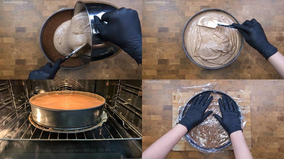 - Wymieszaną masę przelej na podpieczony, wystudzony spód. Włóż do piekarnika nagrzanego do 120 °C i piecz przez ok. 50 minut. Piecz w kąpieli wodnej lub z parą! Po 50 minutach wyłącz piekarnik, ale go nie otwieraj! Wystudź sernik w zaparowanym piekarniku. Po ok. 2h możesz wyciągnąć sernik z piekarnika i odłożyć go na blat. Nie otwieraj drzwiczek piekarnika od razu! Najpierw delikatnie je uchyl. Co kilka minut uchylaj drzwiczki coraz bardziej, aż do całkowitego otwarcia. Im sernik wolniej się studzi tym lepiej. Gwałtowna zmiana temperatury może sprawić, że sernik opadnie. Kiedy sernik zupełnie ostygnie przykryj go folią w kontakcie i włóż do lodówki na ok. 8h.