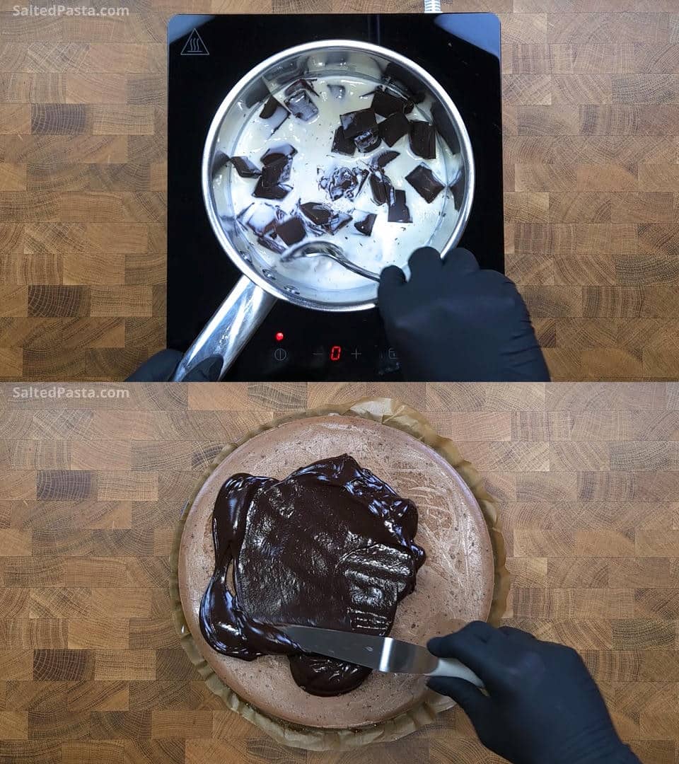 - W rondelku podgrzej śmietankę, ale nie zagotowuj jej. Kiedy para zacznie się unosić znad śmietanki wyłącz grzanie. Do gorącej śmietanki dodaj połamaną na małe kawałeczki czekoladę i mieszaj do całkowitego rozpuszczenia czekolady. Wyciągnij sernik z lodówki, zdejmij folię i rant tortownicy. Polej sernik polewą i wygładź nożem lub szpatułką. Sernik możesz podać od razu lub schować do lodówki. Smacznego!200 g czekolady deserowej, 100 g śmietanki 30%