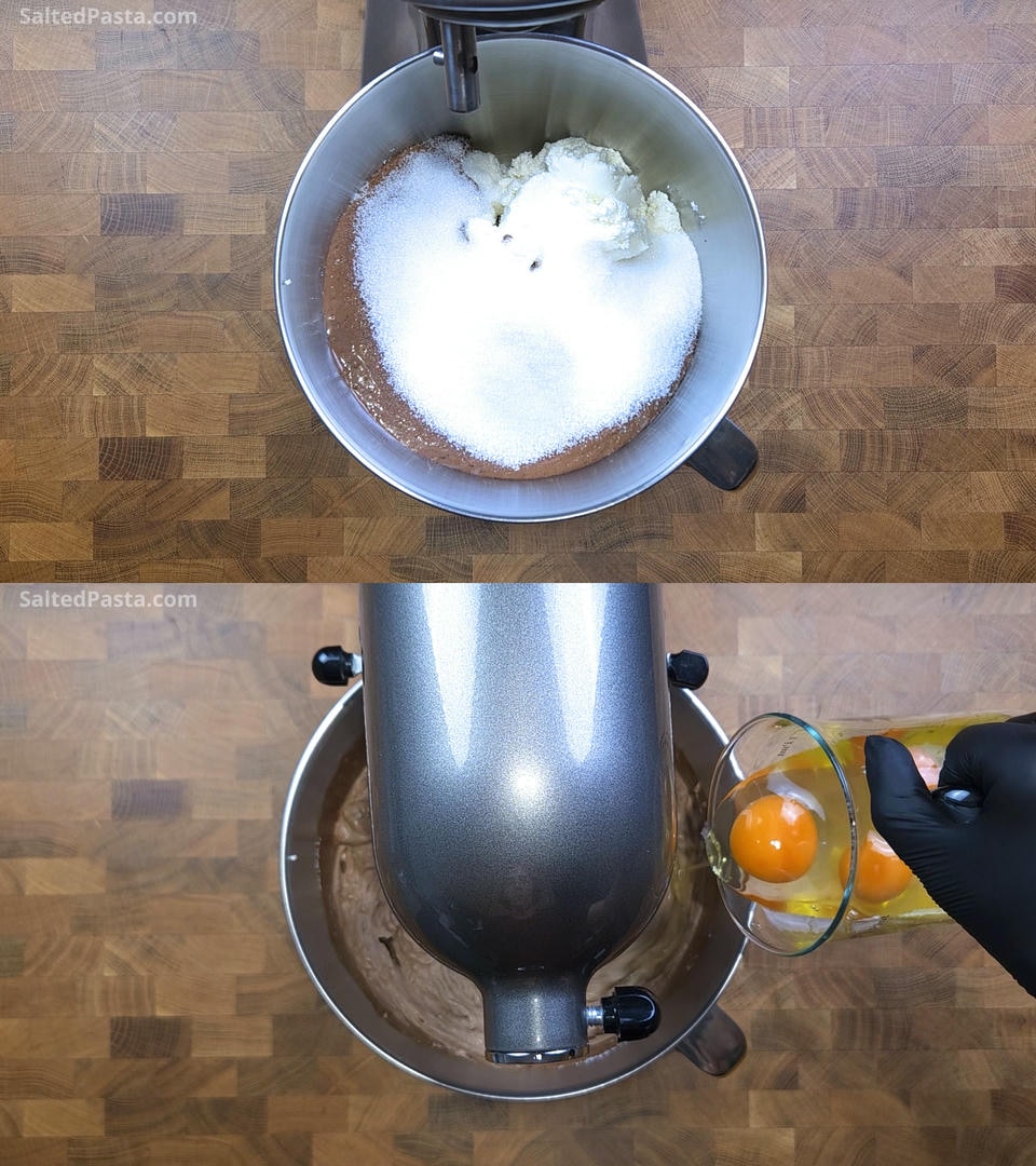 - Do misy miksera włóż ser, zblendowaną kwaśną śmietanę z truflami i cukier. Ubijaj do połączenia składników. Po 2-3 minutach zacznij dodawać jajka pojedynczo (na filmiku wbijam jajka najpierw do osobnego naczynia by łatwiej się je wlewało do masy i by mieć pewność, że żadna skorupka nie wyląduje w serniku. Dzięki temu upewniam się też, że jajka nie są zepsute). Kiedy wszystkie składniki połączą się i utworzą gładką masę wyłącz mikser. Szpatułką zbierz resztki twarogu, których nie zebrał mikser (jeżeli są) i ubijaj jeszcze przez kilka sekund.1 kg sera na sernik 18% tłuszczu, 4 jajka, 200 g cukru
